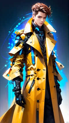 (Side angle view) A stylish futuristic man wearing a distinctive mechanical trench coat, simple background