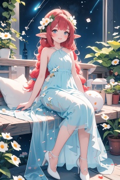 masterpiece,best quality, 1girl,solo,long hair,flower,blue dress,purple eyes,white flower,sitting,bangs,hair ornament,night,hair flower,high heels,white footwear,see-through,sky,shooting star,plant,sleeveless dress,braid,star (sky),potted plant,smile,sleeveless,night sky,bare shoulders,starry sky,red hair,full body,strap slip,petals,blush,indoors,bare arms,jewelry,looking at viewer,pointy ears,elf,head wreath,blunt bangs