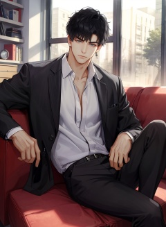 Osborn,<lora:Osborn-000008:1>,, masterpiece,best quality, 1boy,shirt,male focus,jacket,white shirt,solo,sitting,looking at viewer,pants,couch,black jacket,black footwear,open jacket,long sleeves,black pants,open clothes,formal,shoes,collared shirt,