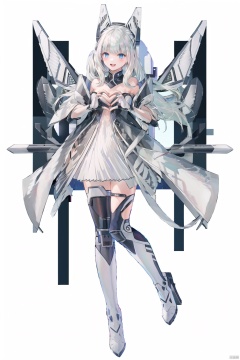 tianqijijijia, solo, 1girl, long hair, white background, blue eyes, open mouth, gloves, smile, looking at viewer, bangs, full body, simple background, mecha musume, dress, fingerless gloves, high heels, white hair, boots, tattoo, thighhighs, :d, breasts, heart hands, elbow gloves, heart, bare shoulders, white dress, floating hair, high heel boots, thigh boots