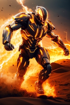 hjyfirerobot,fire,flashing lightning,chaos flame around mecha,rush out from flame and flashing,sleek mecha,front view,robot sleek and smooth helmet,glowing gold armor,masterpiece,best quality,(highly detailed),cyborg,(full body:1.2),wide angle,(sand  background:1.2),run,sunrise,<lora:hjyfirerobot2--000010:1>,