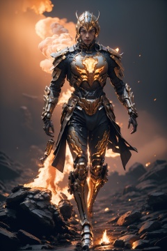 hjyjiazhourbt,1girl,mecha,walking,glowing body border,(fire  and  smoke background:1.3),biomechanical,(looking at viewer),dynamic pose,dynamic angle,(chinese armor:1.4),gold. hi - tech synthetic bio ethereal metal and black titanium material,masterpiece,best quality,(highly detailed),gold hair,(full body:1.3),day light,((bright light)),wide angle,sleek,studio light,<lora:hjyjiazhouRBTcropface-000002:0.8>,