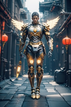 hjyjiazhourbt,mecha,robo wings,walking,(street_background:1.3),(looking at viewer),dynamic pose,dynamic angle,(chinese armor:1.4),gold.shining sparks,Keep hands behind,glowing gold armor,masterpiece,best quality,(highly detailed),1boy,gold hair,cyborg,(full body:1.2),day light,((bright light)),wide angle,shining sparks,silvery,sleek,studio light,( shining blue light circle Science Fiction Portal:1.3),<lora:hjyjiazhouRBTcropface-000002:0.8>,