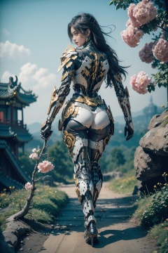 hjyjiazhourbt,1girl,Look back,lush flower garden,(((mecha legs))),(((mecha arm))),hands up,walking,mecha body,A cuirass with a Chinese pattern,(flower and branch  background:1.3),biomechanical,(looking at viewer),(((dynamic pose))),dynamic angle,(chinese armor:1.4),gold. hi - tech synthetic bio ethereal metal and black titanium material,masterpiece,best quality,(highly detailed),gold hair,(full body:1.3),day light,((bright light)),wide angle,sleek,studio light,<lora:hjyjiazhouRBTcropface-000002:0.8>,slender,