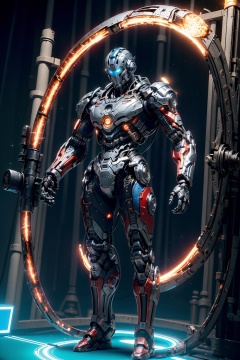 masterpiece,best quality,(highly detailed),male soldier,strong,cyborg,(full body:1.3),day light,bright light,wide angle,white background,<lora:hjyrobo5-000010:0.75>,complex body,shining sparks,(red and black:1.1),studio light,(stand on shining blue light circle Science Fiction Portal:1.2),machinery  time gate  behind,Nuclear reactor core,slivery,