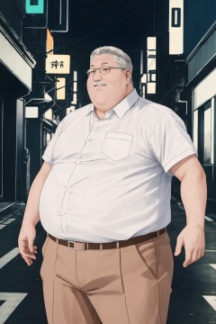 bestquality,masterpiece,8k,1male,安西教练, best quality, (Wear glasses, Wear a suit, White beard, chubby build), cowboy shot,day,light smile, Outdoor neon streets at night, bichu