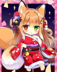 chibi,1 little loli,1girl,japanese clothes,solo,kimono,animal ears,fox ears,long hair,brown hair,heterochromia,tail,fox tail,bell,sash,arrow \(projectile\),obi,green eyes,hair bow,hair ornament,blush,bow,jingle bell,red kimono,looking at viewer,red eyes,black bow,off shoulder,tabi,parted lips,<lora:chibi60A_sdxlLORA:0.8>,, masterpiece, best quality