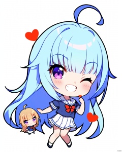 (chibi:1.3), 1 little loli, 1girl, solo, one eye closed, long hair, smile, purple eyes, skirt, heart, white skirt, white background, blue hair, ahoge, grin, simple background, school uniform, looking at viewer, shirt, full body, bangs, short sleeves, shoes, sailor collar, blush,<lora:EMS-268703-EMS:0.800000>