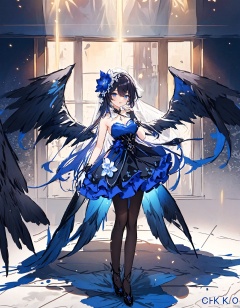 1girl, long hair, dress, black dress, flower, blue eyes, solo, very long hair, breasts, black flower, black hair, hair ornament, black pantyhose, pantyhose, rose, white hair, strapless dress, wings, veil, gloves, frills, hair flower, bangs, multicolored hair, frilled dress, looking at viewer, two-tone hair, black wings, artist name