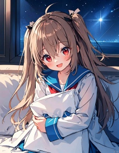 1girl, solo, long hair, smile, object hug, pillow hug, ribbon, pillow, red eyes, sitting, looking at viewer, two side up, brown hair, open mouth, blue sailor collar, bangs, blush, hair between eyes, long sleeves, hair ribbon, white shirt, sailor collar, very long hair, star \(symbol\), shirt, couch, ahoge, :d
