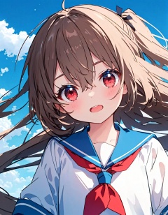 1girl, solo, long hair, outdoors, looking at viewer, red eyes, school uniform, day, neckerchief, sky, serafuku, sailor collar, red neckerchief, ahoge, shirt, white shirt, bangs, hair between eyes, upper body, brown hair, blue sky, cloud, blue sailor collar, hair ribbon