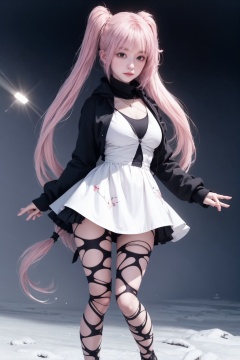 HDR,UHD,8K,best quality,highres,masterpiece,Highly detailed,1girl,full body,Anime,front view,lens flare,light_rays,cute face,big breasts,white skin,leg_warmers,puffer_jacket,print_scarf,pink hair,twintails,covering chest by hand,praying,eye-contact,narrowed eyes,light blush,pasture,snowy mountain,winter,floral_background,,<lora:lrw3:0.7>,