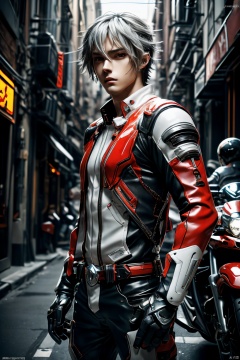 anime style, A cool young man, handsome, motorcycle, short_silver_hair , male avatar, punk, Dragon element, Red, in the style of anime-inspired characters, richly layered, gray and crimson, close up, in the style of anime art, anime artwork