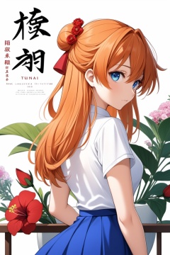 Poster,Poster,a chinese wedding invitation with flowers and a vase,simple background,white background,flower,no humans,leaf,plant,red flower,pink flower,text focus,still life,poster,1girl,solo,souryuu asuka langley,from behind,orange hair,long hair,tsurime,blue eyes,long eyelashes,thick eyelashes,looking at viewer,closed mouth,(white shirt:1.2),short sleeves,skirt,blue skirt,blue dress,outdoors,stairs,standing,ass,