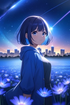 anime girl, night, blue light behind her,  ((Galaxy, Lens flare)), short hair, flower field, night sky, cinematic shot. Wallpaper. (Blue color schema), detailed background, a city in the distance