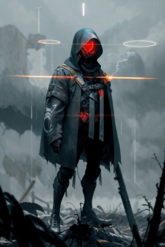 -weapon, solo, gun, 1boy, standing, mask, weapon on back, male focus, full body, 1other, science fiction, blurry,<lora:Apocalypse Aso_20240119162949:1>,Apocalypse Aso,