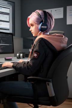 <lora:lida_15:1:lbw=KEEPCHAR>,lida,1girl,solo,headset with microphone,futuristic armored suit,wearing a futuristic armored suit,short hair,sitting,jacket,white hair,indoors,hood,from side,lips,profile,headphones,chair,hood down,headset,realistic,nose,computer,monitor,laptop,keyboard \(computer\),office chair,upper body,blurry,hoodie,desk,cable,mouse \(computer\),screen,a female character with pink hair and wearing headphones and a dark outfit,she is seated at a desk,surrounded by various electronic devices including a computer monitor and a keyboard and other equipment,the setting appears to be a dimly lit room possibly an office or a tech lab,with posters and papers on the walls,the character seems to be focused on her work possibly coding or designing,female character,dark outfit,electronic devices,computer monitor,keyboard,posters,walls,