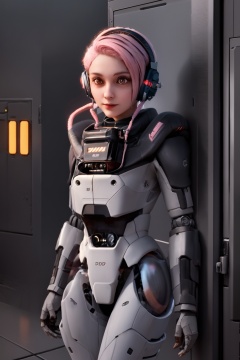 <lora:lida_15_v4:1:lbw=KEEPCHAR>,lida,1girl,solo,looking at viewer,cowboy shot,standing,realistic,cyborg,robot joints,power armor,fingerless gloves,a female character with pink hair,the character has a headset with a microphone attached to her ear,the suit is predominantly gray with black accents and it appears to be made of a metallic material,she is standing in a dimly lit room with a metallic door in the background,the overall ambiance of the image suggests a sci-fi or cyberpunk theme,female character,futuristic armored suit,metallic material,headset with microphone,dimly lit room,metallic door,