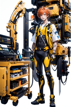 [(white background:1.5)::5],(imid shot:0.95),(full body:1.5),(falt color:1.3),colorful,(masterpiece:1,2),best quality,extremely detailed cg 8k wallpaper,best quality,masterpiece,highres,original,extremely detailed wallpaper,(solo:1.25),glowing,(1 boy:1.5),Mature male,Sunny boy,happy,Short curly orange hair,green eyes,workwear,Tooling,engineer,wrench,pliers,mechanical table,future,science fiction,mechanical device,big fans,Cyber Aso,<lora:Cyber Aso_20240119182540:0.8>,<lora:Cyberworld_20230622141420-000018:0.2>,