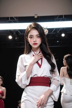 girlvn01, 1girl, hanfu, smile, Stunningly Beautiful girl, Haute_Couture, designer dress, wearing Haute_Couture, posing for a picture, fashion show, long shaped face, dark red eyes, sandy blonde side-wept hair, long hair, long ringlets, catwalk aesthetic, details, highest, amazing,<lora:人间蜜桃:0.35>