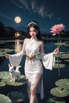 goddess zi on the moon flying near the pond with some lotus flowers, Holding a white rabbit,in the style of harmonious color palette, multilayered compositions, detailed character design, nightmarish illustrations, light amber and green, traditional costumes, vibrant murals<lora:人间蜜桃:0.35>
