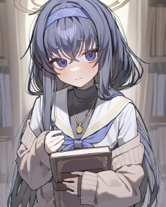 ningen mame, quality good, 1girl, ui (blue archive), solo, book, long hair, black hair, holding book, holding, hairband, bangs, bags under eyes, blue hairband, sailor collar, blush, long sleeves, looking at viewer, cardigan, closed mouth, white sailor collar, hair between eyes, school uniform, halo, upp