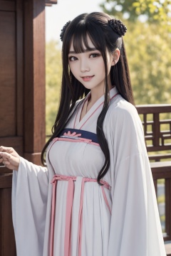 facing viewer,pov,masterpiece,best quality,highly detailed,Amazing,finely detail,extremely detailed CG unity 8k wallpaper,score:>=60,gufenghanfu,1girl,looking at viewer,white dress,hanfu,long sleeves,wide sleeves,standing,<lora:lihua1-000006:0.7>,upper body,large breasts,smile,