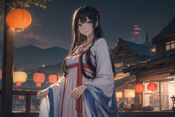 Cinematic Lighting,((night)),panorama,dynamic_angle,((new year)),((lantern festival)),fantasy,realistic,reality,smile,facing viewer,cinematic_angle,masterpiece,best quality,highly detailed,Amazing,finely detail,extremely detailed CG unity 8k wallpaper,score:>=60,gufenghanfu,1girl,looking at viewer,white dress,hanfu,long sleeves,wide sleeves,standing,large breasts,