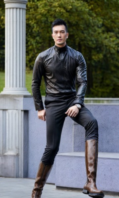1man,asian,exquisite facial features,handsome,tall,male focus,aria_company_uniform,(black knee_boots),gloves,armband,muscular,full body,dynamic pose,(masterpiece, realistic, Realism, best quality, highly detailed, 8K Ultra HD, sharp focus, profession),soft lighting,blurry,outdoors,Dynamic angle,1man