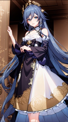 fu hua,white skin,messy hair,yin yang,smile,braided ponytail,braid,blue eyes,1girl,hair between eyes,ponytail,multicolored hair,streaked hair,long hair,bangs, Anime
