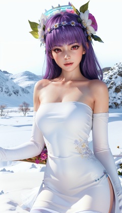 masterpiece,highres,1girl,solo,red eyes,sfw,<lora:add_detail:0.3>,thighhighs,((beautiful Dress+stocking):1.25),((flower headdress:1.45)),((white theme:1.5)),snow,outdoors,snowflakes,sleeveless,3D graphics,looking_at_viewer,ayane,<lora:ayane-000004:0.75>,dynamic pose,dynamic angle,