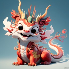 Chinese dragon, cute, solo, looking at viewer, smile, open mouth, simple background, Technology Blue background, full body, black eyes, no humans, happy, Chinese elements, loli, HTTP, jewelry, full body, dragon, scales, looking at viewer, colored sclera, Chinese Dragon Year, joyful atmosphere
