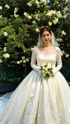 (green lace wedding dress:1.39), veil, wedding gloves, holding flowers,Crystal Earring, Crystal Necklace,