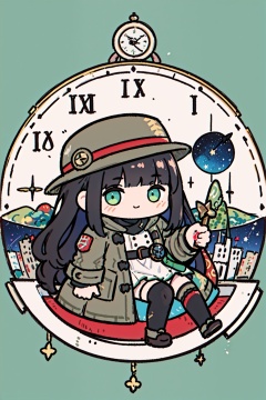 (masterpiece),best quality,highres,stunning art,beautifully painted,colorful,(rim light:1.2),4K wallpapper,fantasy,(panorama),(huge circular flowing round_ramed_clock background),through space,(huge circular flowing transparent hollow round_ramed_clock on top:1.3),complete round_ramed_clock,(((circular surround floating cityscape landscape))),solo,1girl,slim,sitting_invisible_chair,gentle smile,(black thighhighs),long black hair,blunt bangs,green eyes,(khaki fedora),khaki coat,long light-green dress,light-greenshoes,space background,starry_sky,galaxy,red moon.,<lora:生草福娃:1>,