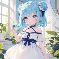 (little loli:1.3), (child:1.2), (Girlish body type), (masterpiece), (best quality), Exquisite visuals, high-definition, (ultra detailed), finely detail, ((solo)),(beautiful detailed eyes), short hair, blue hair, double_bun, asymmetrical bangs, blueberry hair ornament, loveliness, off shoulder, looking at viewer, bare shoulders, standing,