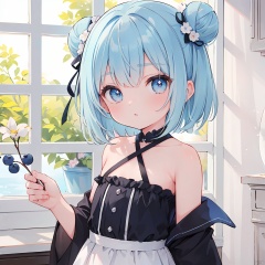 (little loli:1.3), (child:1.2), (Girlish body type), (masterpiece), (best quality), Exquisite visuals, high-definition, (ultra detailed), finely detail, ((solo)),(beautiful detailed eyes), short hair, blue hair, double_bun, asymmetrical bangs, blueberry hair ornament, loveliness, off shoulder, looking at viewer, bare shoulders, standing,