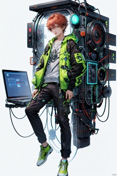 [(white background:1.5)::5],(imid shot:0.95),(full body:1.25),(falt color:1.3),colorful,(masterpiece:1,2),best quality,extremely detailed cg 8k wallpaper,best quality,masterpiece,highres,original,extremely detailed wallpaper,(solo:1.25),(1 boy:1.5),Short curly orange hair,green eyes,blue Angel aperture,Tooling,engineer,wrench,pliers,mechanical table,future,science fiction,mechanical device,glowing fan,Cyber Aso,, Cyber Aso