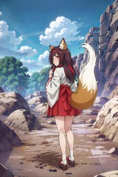 ((masterpiece,best quality)), absurdres,<lora:Isekai_Onsen_Paradise:0.8>, 1girl, solo, long hair, looking at viewer, blush, skirt, brown hair, black hair, long sleeves, animal ears, very long hair, closed mouth, standing, tail, full body, hairband, outdoors, japanese clothes, sky, day, socks, looking back, cloud, wide sleeves, kimono, blurry, blue sky, animal ear fluff, fox ears, blurry background, fox tail, white socks, fox girl, ribbon trim, hakama, hakama skirt, ribbon-trimmed sleeves, white kimono, miko, tabi, hakama short skirt, red hakama, zouri,outdoors,