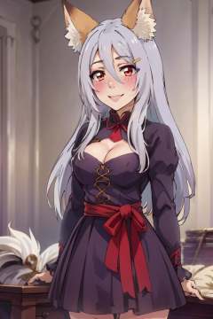 ((masterpiece,best quality)), absurdres,<lora:Isekai_Onsen_Paradise:0.8>, 1girl, long hair, blush, skirt, white hair, ribbon, animal ears, purple caplet, red eyes, cleavage cutout, fox ears, purple dress, long sleeves, purple bow, animal ears, hair between eyes, grey hair, hairclip, looking at viewer, smile,