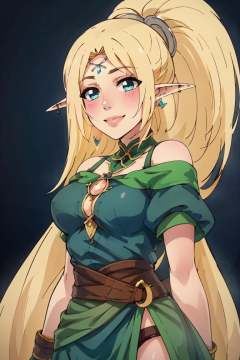 ((masterpiece,best quality)), absurdres,<lora:Isekai_Onsen_Paradise:0.8>, cowboy shot, 1girl, solo, long hair, looking at viewer, blush, blue eyes, blonde hair, simple background, white background, jewelry, ponytail, earrings, pointy ears, smile, elf, circlet, green clothes,