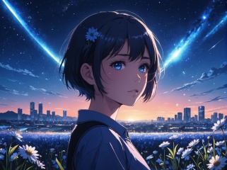 anime girl, night, blue light behind her,  ((Galaxy, Lens flare)), short hair, flower field, night sky, cinematic shot. Wallpaper. (Blue color schema), detailed background, a city in the distance