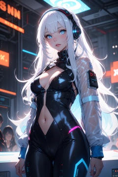1girl, solo, long white hair, blue eyes, bangs, lips, bodysuit, covered navel, glowing, skin tight, headset, science fiction, head-mounted display, cyberpunk, hologram