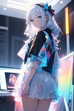masterpiece, colorful,(abstract line art t:1.2),continuous, virtual world, a girl in a long skirt standing on the keyboard of a notebook computer, back, white background,simple background,best quality, block, fingerprint, luminescence, data torrent, information torrent,lenovo_AIPC,(lenovo laptop:1.1), silhouette,