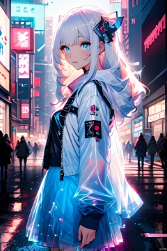 Gorgeous face with details, long eyebrows.cityscape, clothing cutout, (cropped jacket), cyberpunk, from side, dramatic, key visual, vibrant, highly detailed,