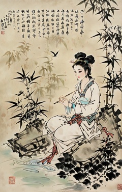 1girl, Baibohua, solo, black hair, jewelry, bracelet, necklace, chinese clothes, chinese text, dress, hair bun, plant, earrings, hair ornament, flower, beads, long sleeves, bamboo a painting of a woman sitting on a rock next to a bamboo tree and water with a bird flying over it, <lora:XL_Baibo:0.7>