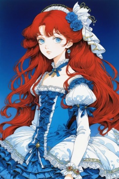 portrait, Long red hair, blue eyes, white skin, cute 12 year old skinny princess in a blue Rococo dress, artwork by Masamune Shirow.crazy colors