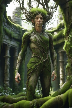 Bioengineered tree-human hybrid,looking at viewer,entwined branches for hair,bark skin,foliage sprouting from body,standing in an overgrown ruins,with moss and vines,ultra realistic,high resolution,depth of field,aesthetic,product introduction photo,