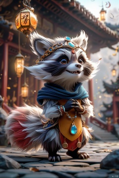 shanhaijing,Cute little raccoon, solo, looking at viewer, smile, open mouth, jewelry, standing, tail, full body, male focus, teeth, artist name, blurry, blurry background, fangs, gem, furry, forehead jewel