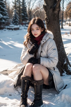girl in a snowy landscape,winter coat,fluffy hood,white fur trim,breath visible in cold air,soft falling snowflakes,glistening snow on trees,icy blue eyes,warm gloves,red scarf wrapped snugly,boots with fur lining,frost-covered branches,gentle smile,rosy cheeks from cold,playful pose,snowy hills in background,distant snow-covered mountains,crisp winter sun,shadows on snow,tranquil winter scene,(best quality,4k,8k,highres,masterpiece:1.2),ultra-detailed,(realistic,photorealistic,photo-realistic:1.37),HDR,UHD,studio lighting,sharp focus,physically-based rendering,extreme detail description,professional,vivid colors,bokeh,