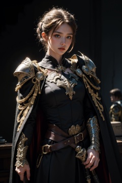 serious look pressed lips, (black updo:1.2), (black steel armor:1.1) and robes (cape:1.2) royalty ornate (embroidery:0.5) with sword, skinny (Gorget Plackart pauldron :1.3), (masterpiece:1.2) (illustration:1.1) (best quality:1.2) (detailed) (intricate) (8k) (HDR) (wallpaper) (cinematic lighting) (sharp focus)